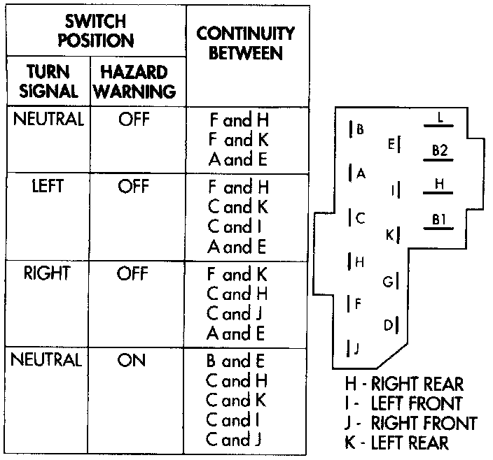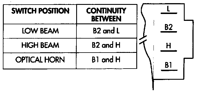To test the switch, first disconnect the negative battery cable, then remove the upper and lower column shrouds to gain access to the switch connector. Remove switch connector. Using an ohmmeter, test for continuity (no resistance) between the terminals of the switch as shown.