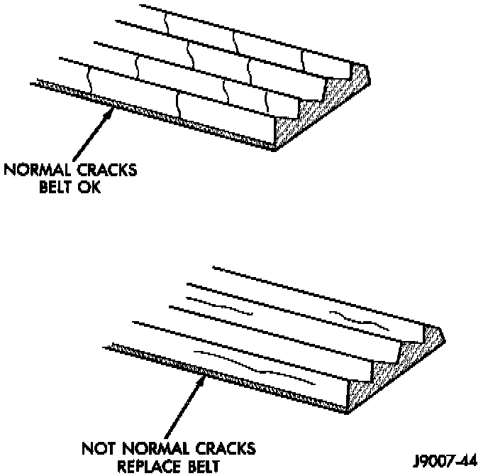 Poly-V-Belt system may develop minor cracks across the ribbed side. These minor cracks are considered normal and acceptable. Cracks parallel are not.