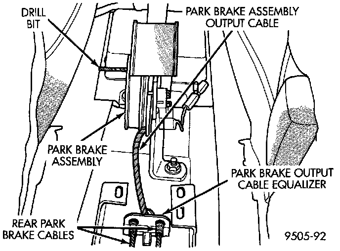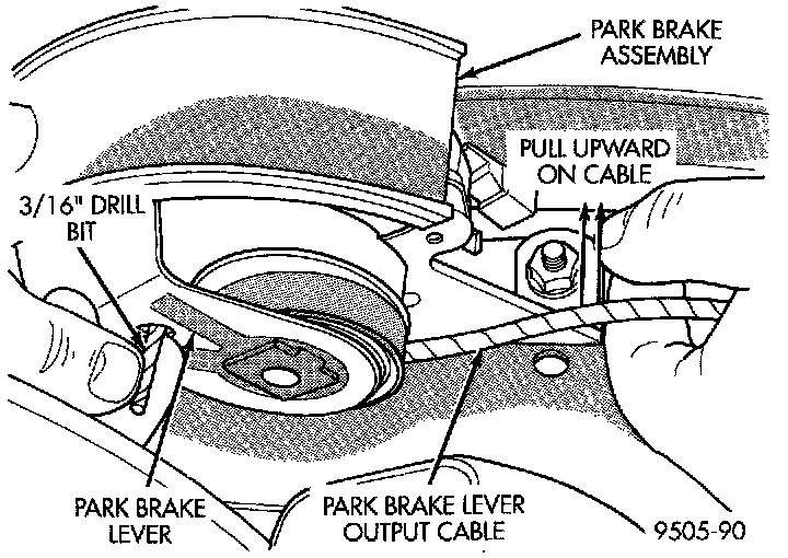 8. Grasp park brake lever output cable by hand and pull upward. Continue pulling on cable until a 3/16 in. drill bit can be inserted into handle and sector gear of park brake mechanism. This will lock the park brake mechanism and take tension off park brake cables.