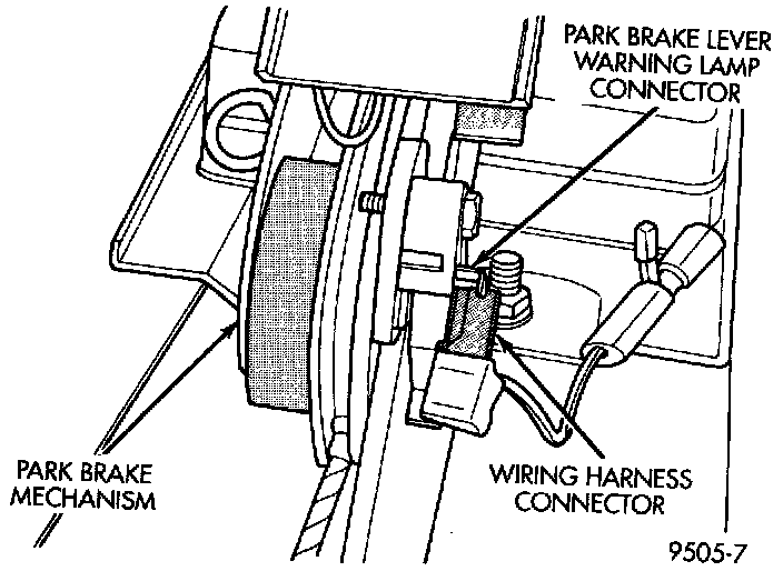 10. Remove wiring harness electrical connector for brake warning light from park brake lever.