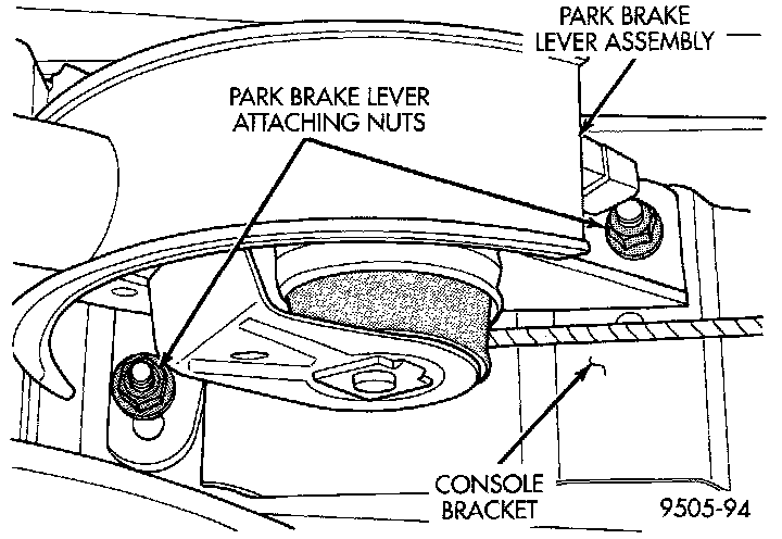 11. Remove the two nuts attaching park brake lever to console bracket. Remove park brake lever mechanism from vehicle.