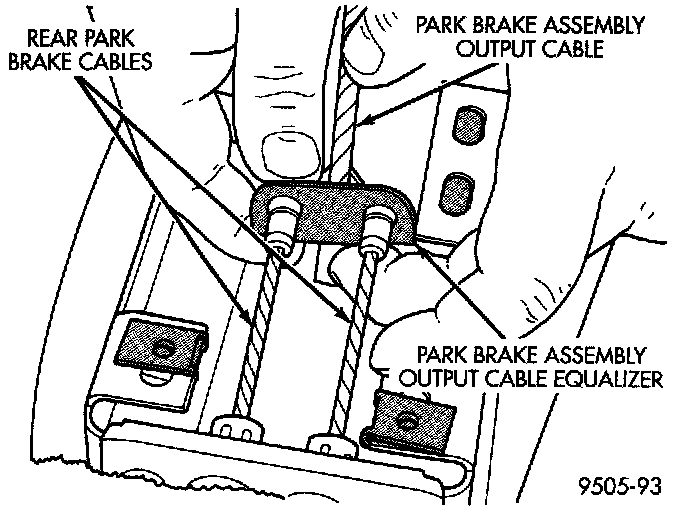 4. Install both rear park brake cables into equalizer on park brake lever output cable.