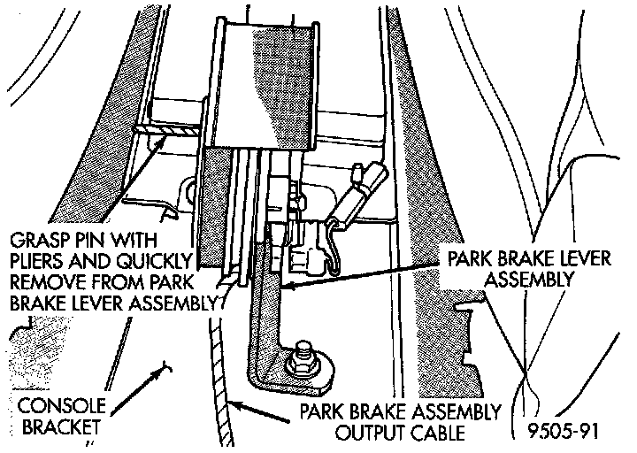 NOTE: The park brake lever can be in any position when releasing the auto adjuster. To ease installation of center console, it is advisable to pull park brake lever handle all the way up before removing lockout pin.