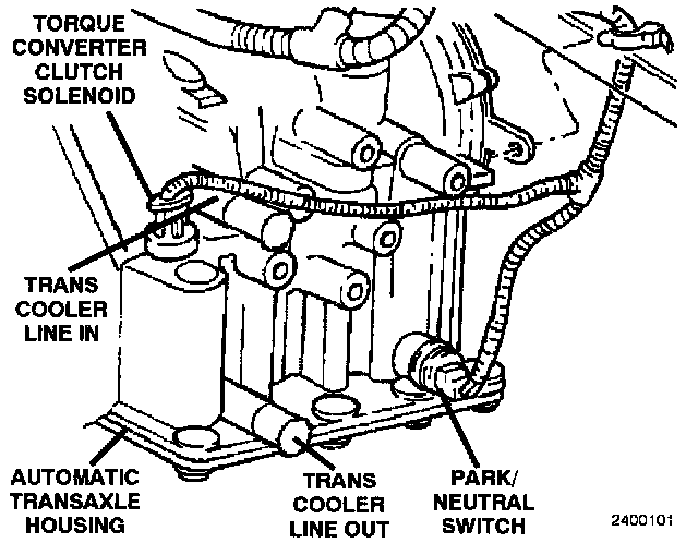 Torque Converter Clutch Solenoid, Trans Cooler Line In, Automatic Transaxle Housing, Trans Cooler Line Out, Park/neutral: