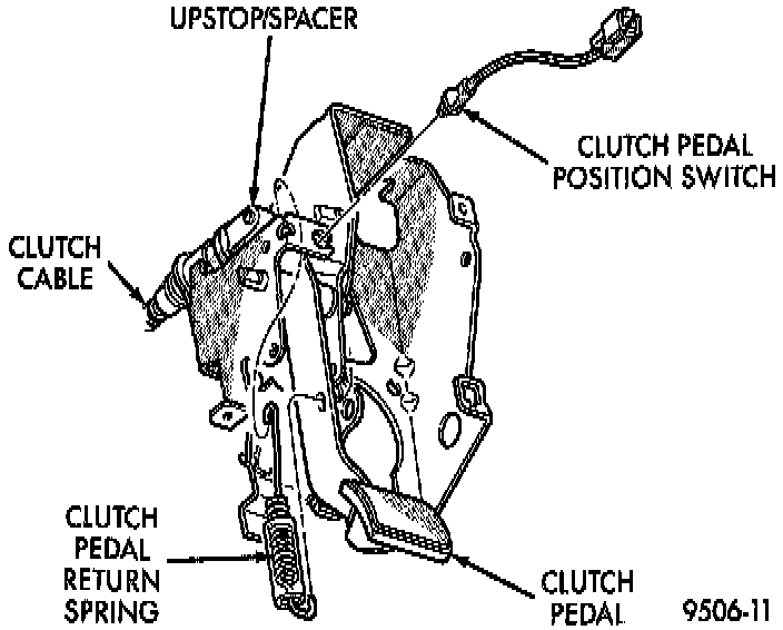 The clutch pedal position switch functions as a safety interlock device. It prevents possible engine cranking with the clutch engaged.The clutch pedal position switch is wired in series between the starter relay coil and the ignition switch.
