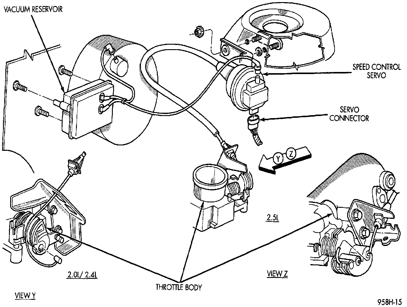 The speed control servo cable is connected between the speed control vacuum servo diaphragm and the throttle body control linkage. This cable causes the throttle control linkage to open or close the throttle valve in response to movement of the vacuum servo diaphragm.
