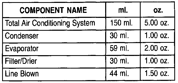 When an air conditioning system is first assembled, all components (except the compressor) are refrigerant oil free. After the system has been charged with (R-134a) refrigerant and operated, the oil in the compressor is dispersed through the lines and components. The evaporator, condenser, and receiver/drier will retain a significant amount of oil. Refer to the A/C Component Refrigerant Oil Capacities table. When a component is replaced, the specified amount of refrigerant oil must be added. When the compressor is replaced, the amount of oil that is retained in the rest of the system must be drained from the replacement compressor. When a line or component has ruptured and oil has escaped, the compressor should be removed and drained. The receiver/drier must be replaced along with the ruptured part. The oil capacity of the system minus the amount of oil still in the remaining components, can be measured and poured into the suction port of the compressor.