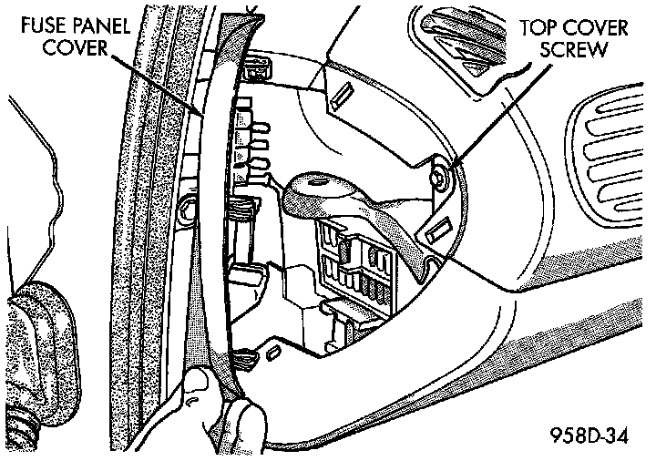 2. Remove fuse panel cover from left end of instrument panel. Remove screw holding end of instrument panel top cover.