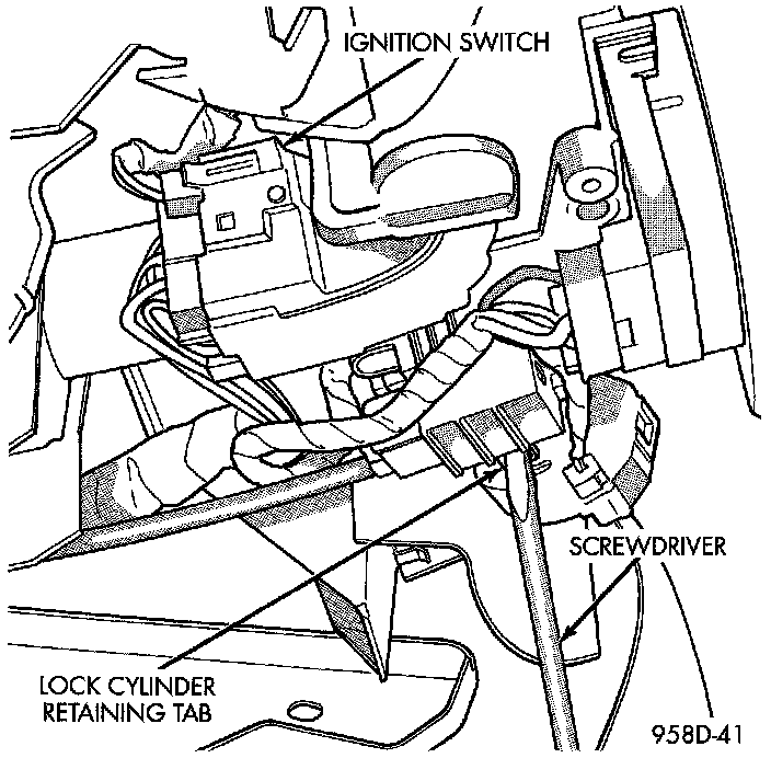 12. Place key cylinder in RUN position. Depress lock cylinder retaining tab and remove key cylinder.