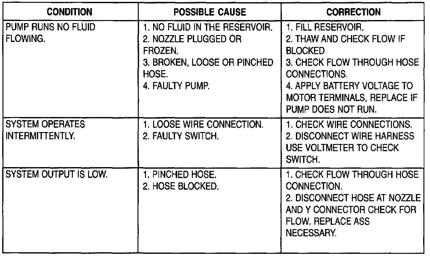 The following is a list of general wiper motor system problems and tests that are to be performed to locate the faulty part, and the corrective action to be taken. These tests will cover both two speed and intermittent wiper functions.