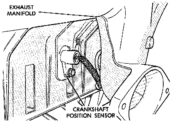 A heat shield covers the crankshaft position sensor. The sensor is located in the middle of the right side of the cylinder block, just above the oil pan.