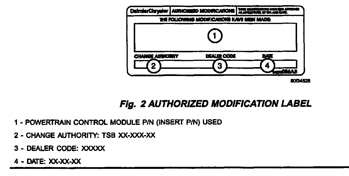 4. Type the necessary information on the "Authorized Modification Label" p/n 04275086AB and attach near the VECI label (Fig. 2).