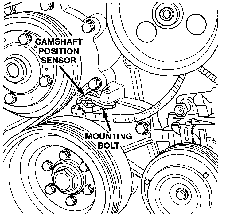 The camshaft position sensor is mounted in the front of the timing case cover. The bottom of the sensor is positioned in front of the camshaft sprocket.