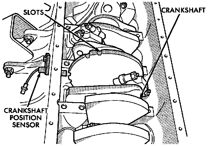 The crankshaft position sensor detects slots cut into a disk in the middle of the crankshaft. There are 5 sets of slots. Each set contains 2 slots, for a total of 10 slots. Basic timing is determined by the position of the last slot in each group. Once the Powertrain Control Module (PCM) senses the last slot, it determines crankshaft position (which piston will be next at TDC) from the camshaft position sensor input. It may take the PCM up to one engine revolution to determine crankshaft position during cranking.