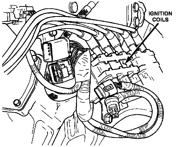 The electronic ignition system uses two epoxy filled coil packs mounted on a bracket at the rear of the engine. The coil pack on the left side, contains three separate coils and fires cylinders 1, 2, 3, 4, 6, and 7. The coil pack on the right side, contains two individual coils and fires cylinders 5, 8, 9, and 10. When one of the coils discharges, it fires two cylinders at the same time (one cylinder on its compression stroke, the other on its exhaust stroke).