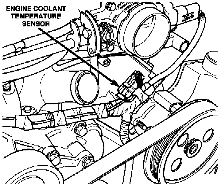 The engine coolant temperature sensor threads into the cylinder head behind the Power Steering Pump. The sensor provides an input to the Powertrain Control Module (PCM). As coolant temperature varies, the sensor resistance changes, resulting in a different input voltage to the PCM.