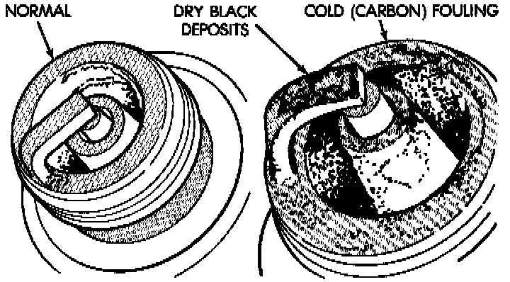 Cold fouling is normal after short operating periods. The spark plugs do not reach a high enough operating temperature during short operating periods. Replace carbon fouled plugs with new spark plugs.