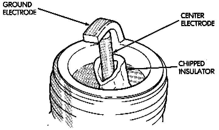 A chipped electrode insulator usually results from bending the center electrode while adjusting the spark plug electrode gap. Under certain conditions, severe detonation also can separate the insulator from the center electrode. Spark plugs with chipped electrode insulators must be replaced.