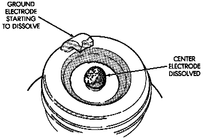 Excessive combustion chamber temperature can cause preignition damage. First, the center electrode dissolves and the ground electrode dissolves somewhat later. Insulators appear relatively deposit free. Determine if the spark plugs are the correct type, as specified on the VECI label, or if other operating conditions are causing engine overheating.