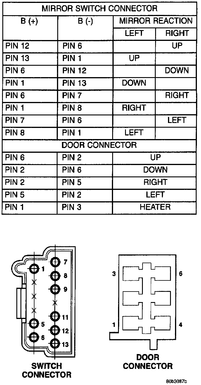 3. Using two jumper wires, one connected to a 12 volt source, and the other connected to a good body ground. Jumpers are applied to the mating switch connector on the wire harness. Refer to the Mirror Test table for appropriate mirror response.