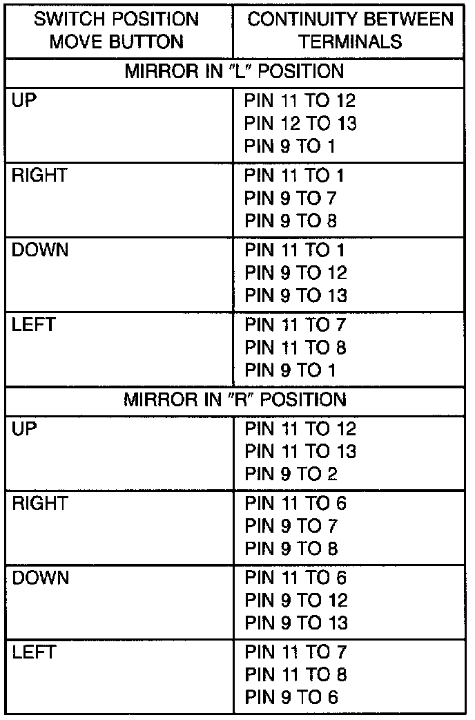 4. Using an ohmmeter, test for continuity between the terminals of the switch as shown in the Mirror Switch Test table.