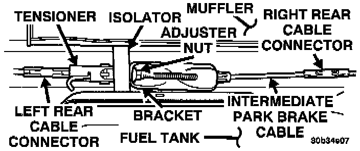 2. Remove the park brake tensioner adjuster nut, releasing the tensioner from the equalizer bracket to the intermediate cable.