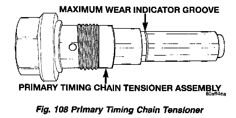 2. Viewing through the cylinder head timing drive cavity, inspect the primary chain tensioner plunger. Rotate the engine clockwise to remove any chain slack and to achieve the maximum tensioner extension. If a machined groove on the plunger is visible, the timing chain and/or related components are worn or stretched to service limits.