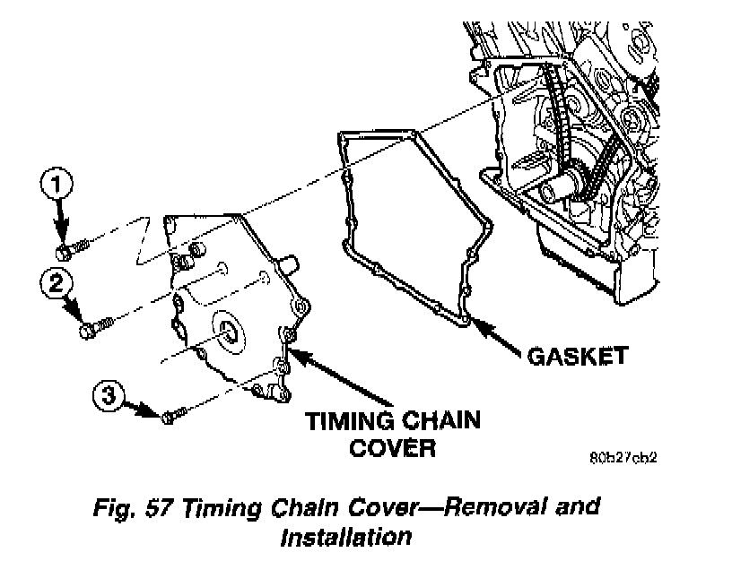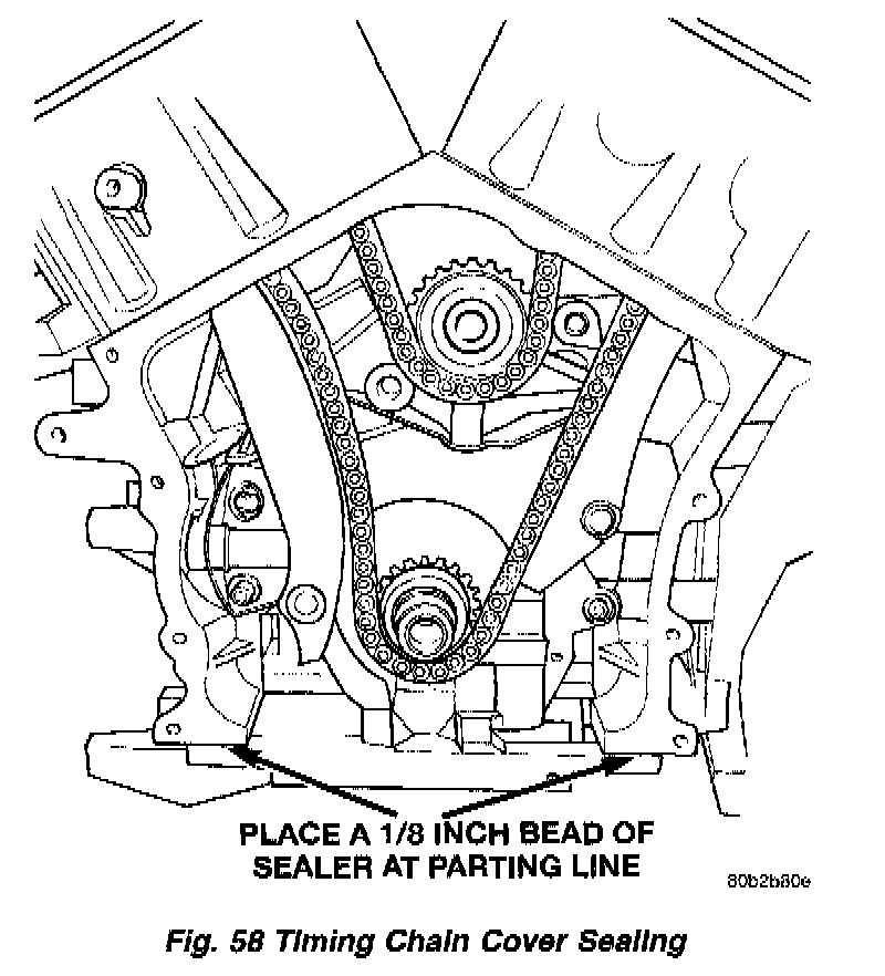 3. Before installing timing cover gasket apply a 1/8 inch bead of Mopar (R) Silicone Rubber Adhesive Sealant to the parting lines between the oil pan and cylinder block (Fig. 58).