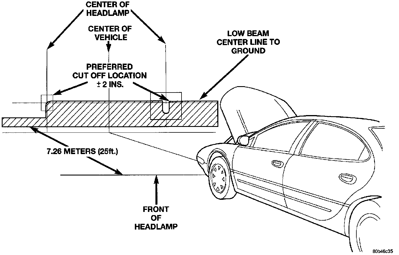 1. Position vehicle on a level surface perpendicular to a flat wall 7.62 meters (25 ft.) away from front of headlamp lens.