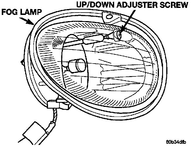 Prepare an alignment screen. Refer to alignment Screen Preparation paragraph. A properly aligned fog lamp will project a pattern on the alignment screen 100 mm (4 in.) below the fog lamp center line and straight ahead. To adjust fog lamp alignment, rotate the alignment screw.