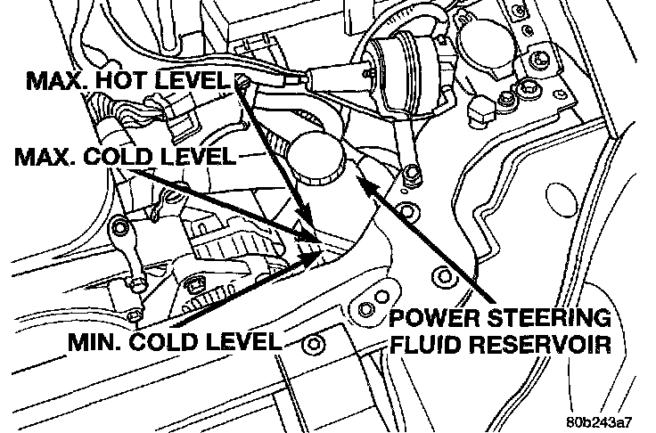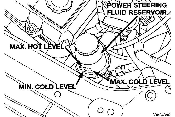 Wipe off the power steering fluid reservoir so that it is free of dirt. Check the fill level of the power steering fluid in the reservoir according to the markings on the side of the reservoir. The MAX. COLD/MIN. COLD fluid levels are to be measured with the power steering fluid at a normal ambient temperature of approximately 32°C to 43°C (90°F to 110°F). In all pumps add fluid as necessary, using only Mopar (R) Power Steering Fluid, or an equivalent. DO NOT USE ANY TYPE OF AUTOMATIC TRANSMISSION FLUID.