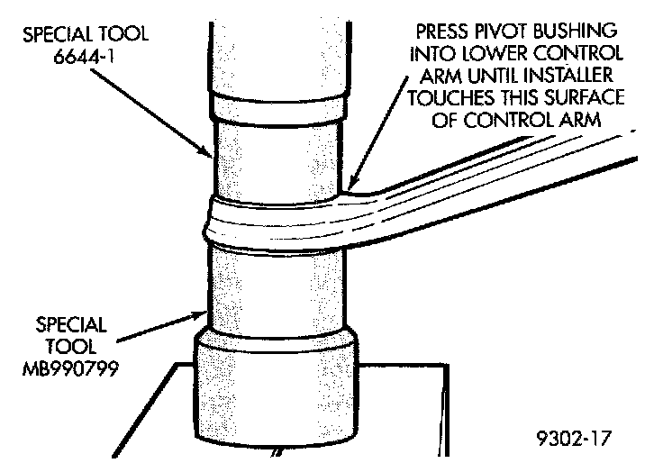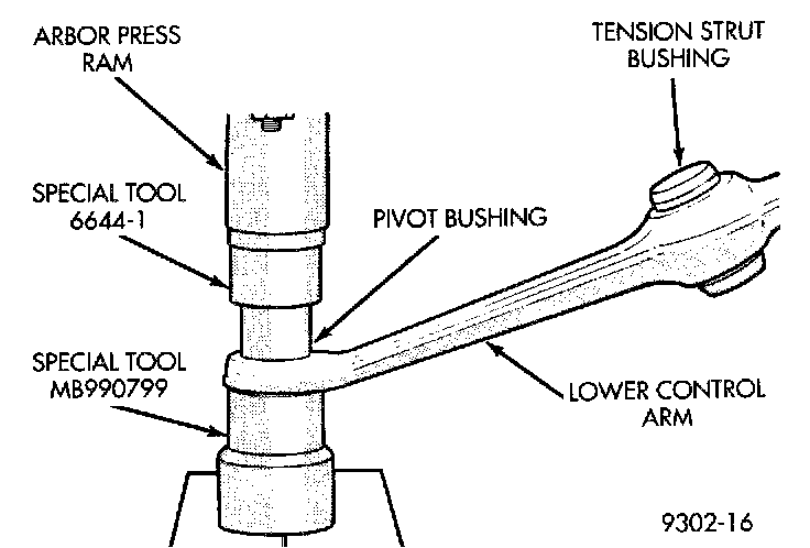 4. Position lower control arm in arbor press with large end of pivot bushing inside Receiver, Special Tool MB-990799, and special tool supporting lower control arm. Position Remover, Special Tool, 6644-2 on top of pivot bushing. Using the arbor press, press the lower control arm pivot bushing out of lower control arm.