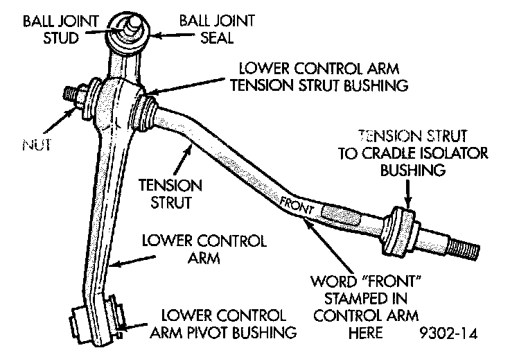 4. Install tension strut into the tension strut bushing in lower control arm. Position tension strut in lower control as shown, with word FRONT stamped in tension strut positioned away from control arm. With an open end wrench on flat of tension strut to stop tension strut from turning. Tighten the NEW tension strut to lower control retaining nut to a torque of 130 Nm (95 ft. lbs.).