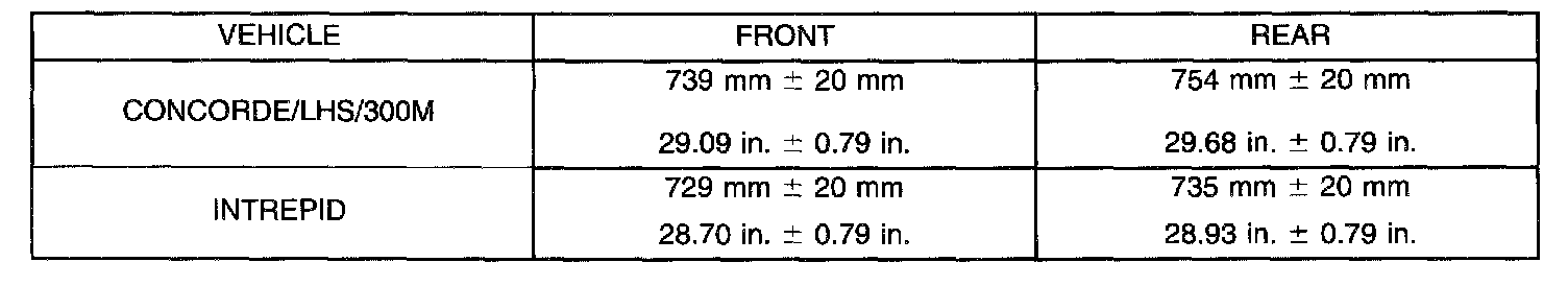 Vehicle height is to be checked with the vehicle on a flat, level surface, preferably a vehicle alignment rack. The tires are to be inflated to the recommended pressure. All tires are to be the same size as standard equipment. Vehicle height is checked with the fuel tank full of fuel, and no passenger or luggage compartment load.