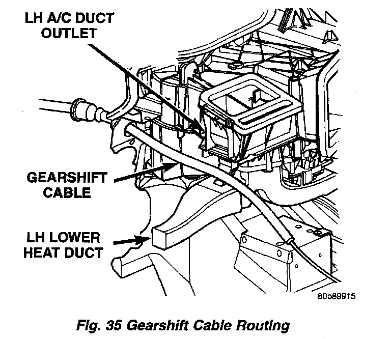 9. Inside the vehicle, route the gearshift cable between the left a/c duct and the left lower heat duct (Fig. 35) and up to the steering column.