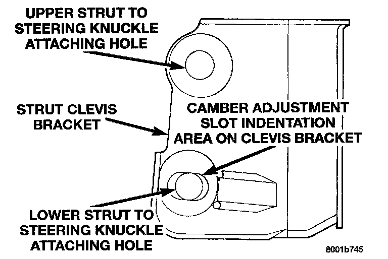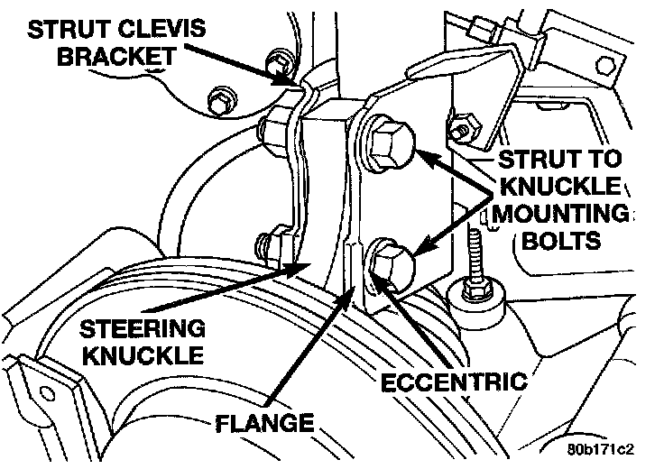 11. Adjust the front camber to the preferred setting (or desired setting if being used for off-street competition purposes) by rotating the lower eccentric cam bolt against the cam stop areas on the strut clevis bracket. When camber is correctly set, tighten the upper strut clevis bracket bolt and lower cam bolt. Again jounce front and rear of vehicle an equal amount of times and verify front camber setting. See Alignment Specifications for required specifications.