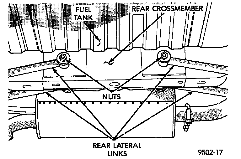 1. Loosen the nuts on the left and right rear lateral link attaching bolts at the rear crossmember.