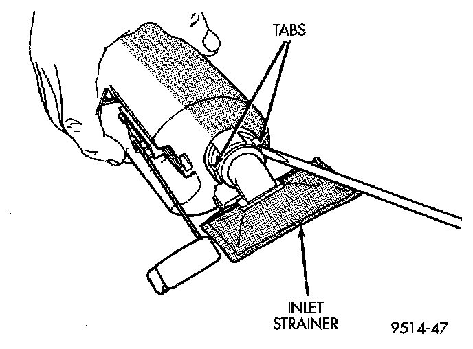 2. Using a thin straight blade screwdriver, pry back the locking tabs on fuel pump reservoir and remove the strainer.