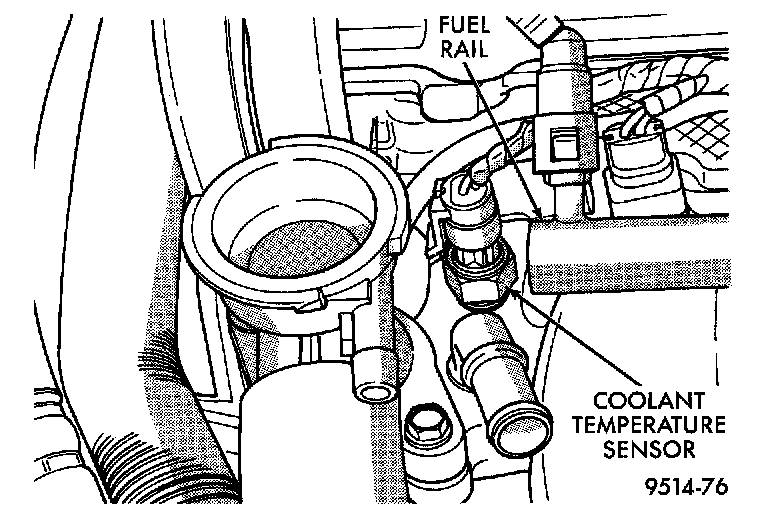 The coolant sensor threads into the intake manifold next to the thermostat housing. New sensors have sealant applied to the threads.
