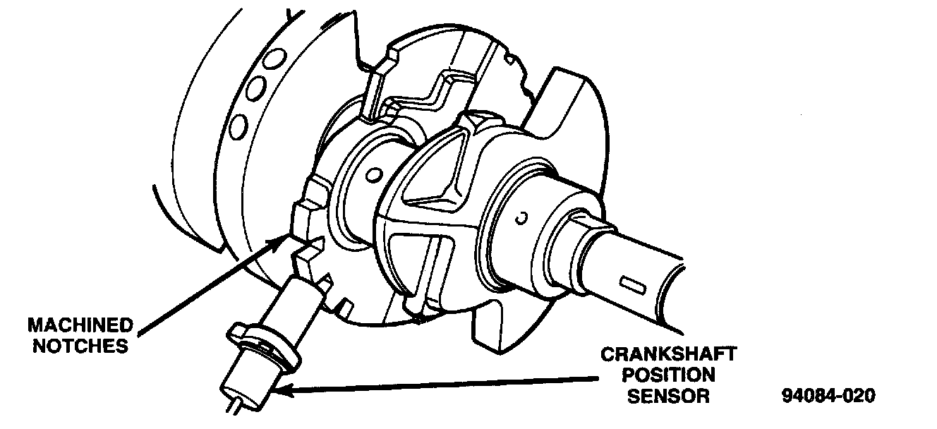 The notches generate pulses from high to low in the crankshaft position sensor output voltage. When a metal portion of the counterweight aligns with the crankshaft position sensor, the sensor output voltage goes low (less than 0.5 volts). When a notch aligns with the sensor, voltage goes high (5.0 volts). As a group of notches pass under the sensor the output voltage switches from low (metal) to high (notch) then back to low.