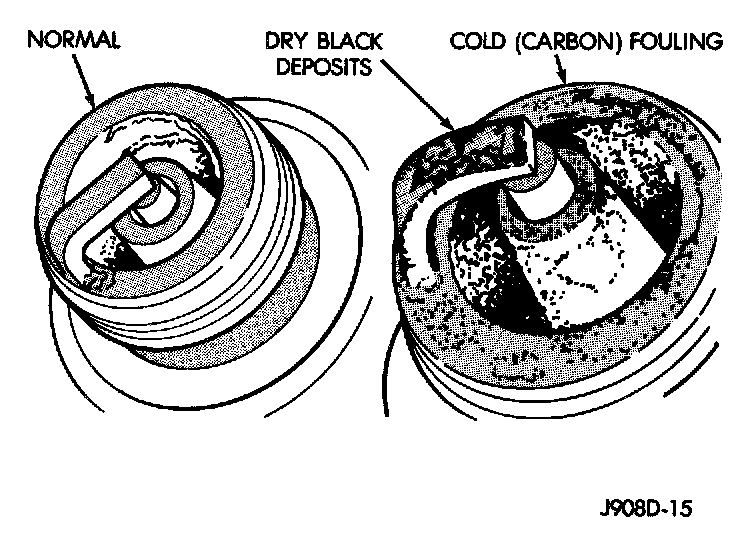 Cold fouling is normal after short operating periods. The spark plugs do not reach a high enough operating temperature during short operating periods. Replace carbon fouled plugs with new spark plugs.