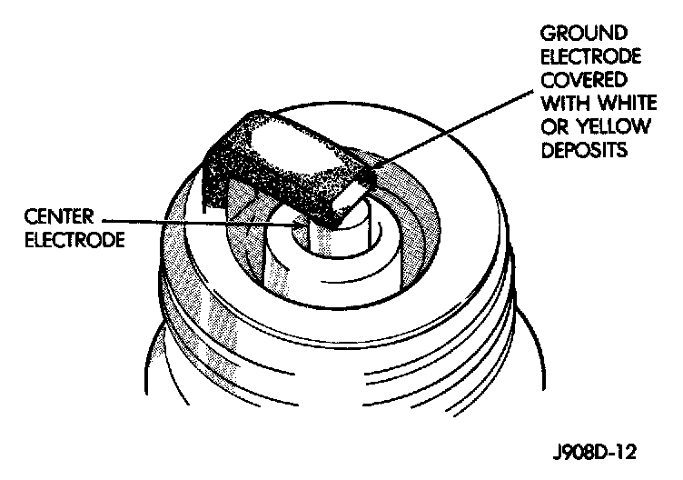 Fuel scavenger deposits may be either white or yellow. They may appear to be harmful, but are a normal condition caused by chemical additives in certain fuels. These additives are designed to change the chemical nature of deposits and decrease spark plug misfire tendencies. Notice that accumulation on the ground electrode and shell area may be heavy but the deposits are easily removed. Spark plugs with scavenger deposits can be considered normal in condition, cleaned and reused.
