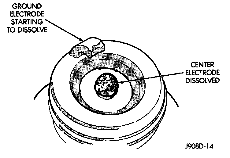 Excessive combustion chamber temperature can cause preignition damage. First, the center electrode dissolves and the ground electrode dissolves somewhat later. Insulators appear relatively deposit free. Determine if the spark plugs are the correct type, as specified on the VECI label, or if other operating conditions are causing engine overheating.