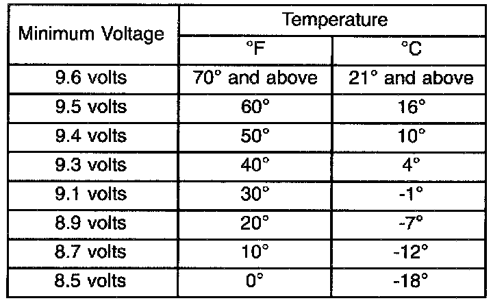 5. Voltage drop will vary according to battery temperature at the time of the load test. Battery temperature can be estimated by the temperature of exposure over the preceding several hours. If the battery has been charged or boosted a few minutes prior to the test, the battery would be slightly warmer. Refer to Battery Load Test Temperatures Table for proper voltage/temperature reading.
