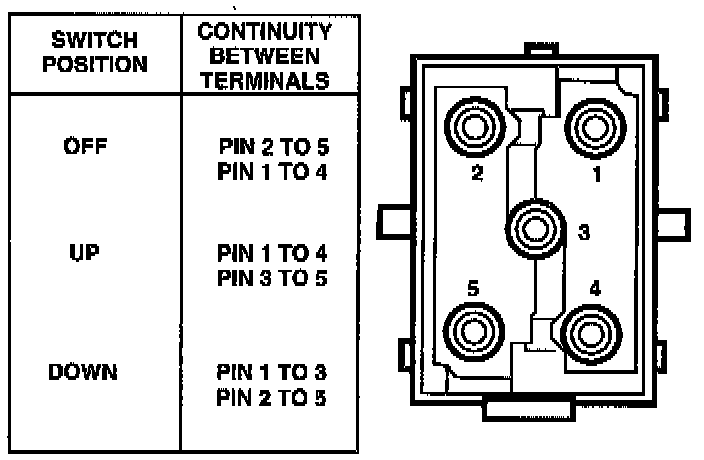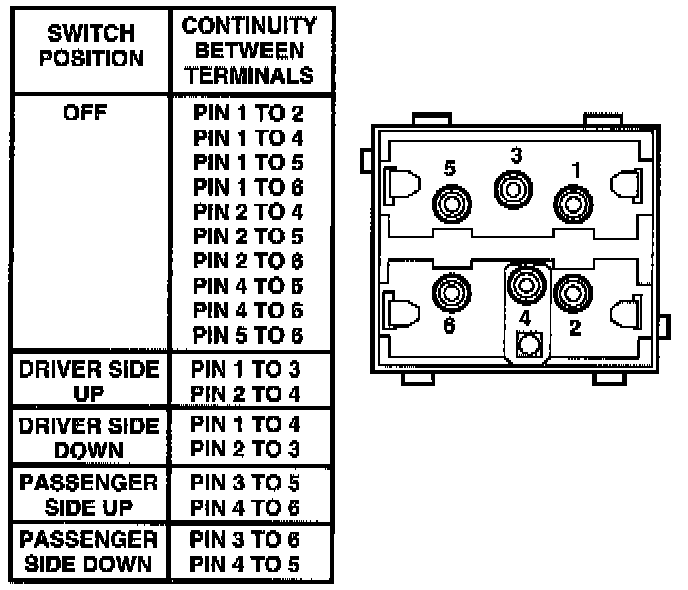 Remove switch for testing. Connect a voltmeter positive lead to Pin 4 and negative lead to Pin 3 of the switch connector. Turn ignition switch to the ON position. Voltmeter should read battery voltage. If OK, go to Window Switch Test. If not OK, check the 30 amp circuit breaker behind the fuse block or for a broken wire.