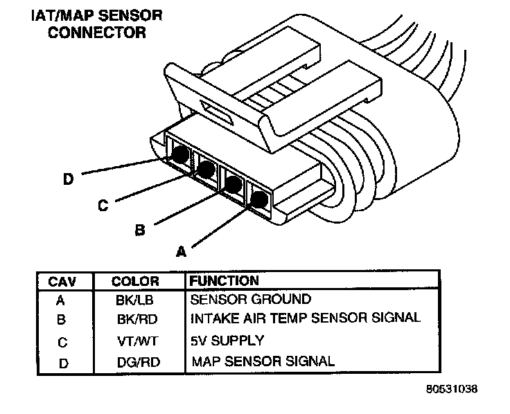 1. Test the MAP sensor output voltage at the MAP sensor connector between terminals 1or A and 3 or D. With the ignition switch ON and the engine not running, output voltage should be 4 to 5 volts. The voltage should drop to 1.5 to 2.1 volts with a hot, neutral idle speed condition. If OK, go to next step. If not OK, go to step 3.