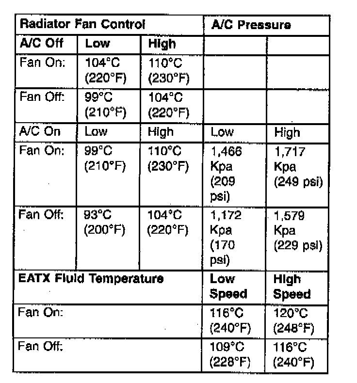 Fan control is accomplished three ways. The fan runs when the air conditioning pressure reaches a set psi see charts below. In addition to this control, the fan is turned on by the temperature of the coolant which is sensed by the coolant temperature sensor which sends the message to the Powertrain Control Module (PCM). The PCM turns on the fan through a fan relay. On models equipped with automatic transmission, a transmission fluid thermistor may have some influences on fan operation. See Wiring Diagrams for circuity and diagnostics provided.