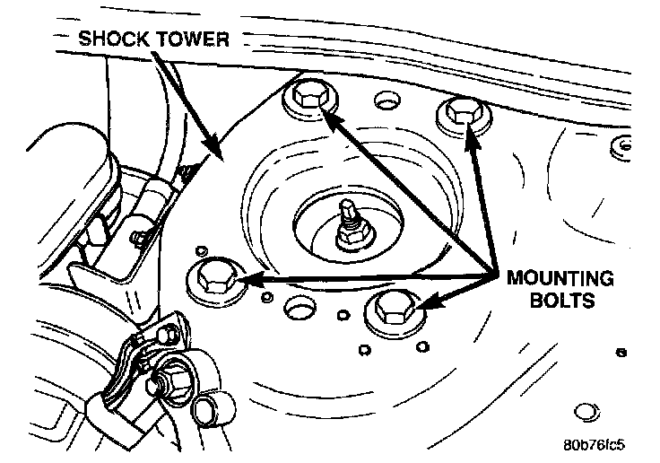 3. Loosen the shock assembly mounting bolts on the side marked in step 1. Loosen the bolts enough to allow adequate space for removal of the plastic locating pins that align the upper mounting bracket with the shock tower.
