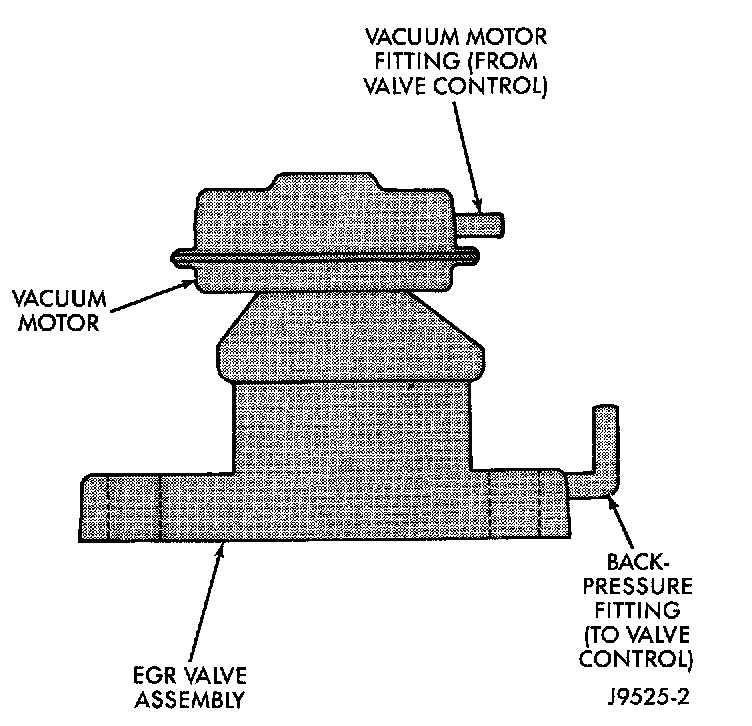 1. All engines are equipped with two fittings located on the EGR valve. The upper fitting (located on the vacuum motor) supplies engine vacuum to a diaphragm within the EGR valve for valve operation. The lower fitting (located on the base of the EGR valve) is used to supply exhaust back-pressure to the EGR valve control.
