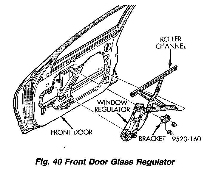 8. Slide regulator rearward and rotate forward end of roller channel through access hole in door panel.